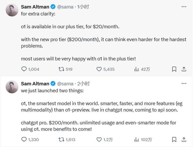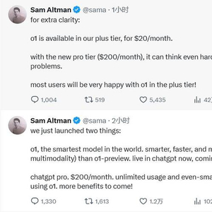 Altman在社交媒体发帖而极少,OpenAI本周四有两个新动作,一是在ChatGPT Plus套餐中纳入了o1,每月收费20美元,二是推出每月收费200美元的ChatGPT Pro,它可以让订阅者无限使用模型、甚至时更智能的o1。
