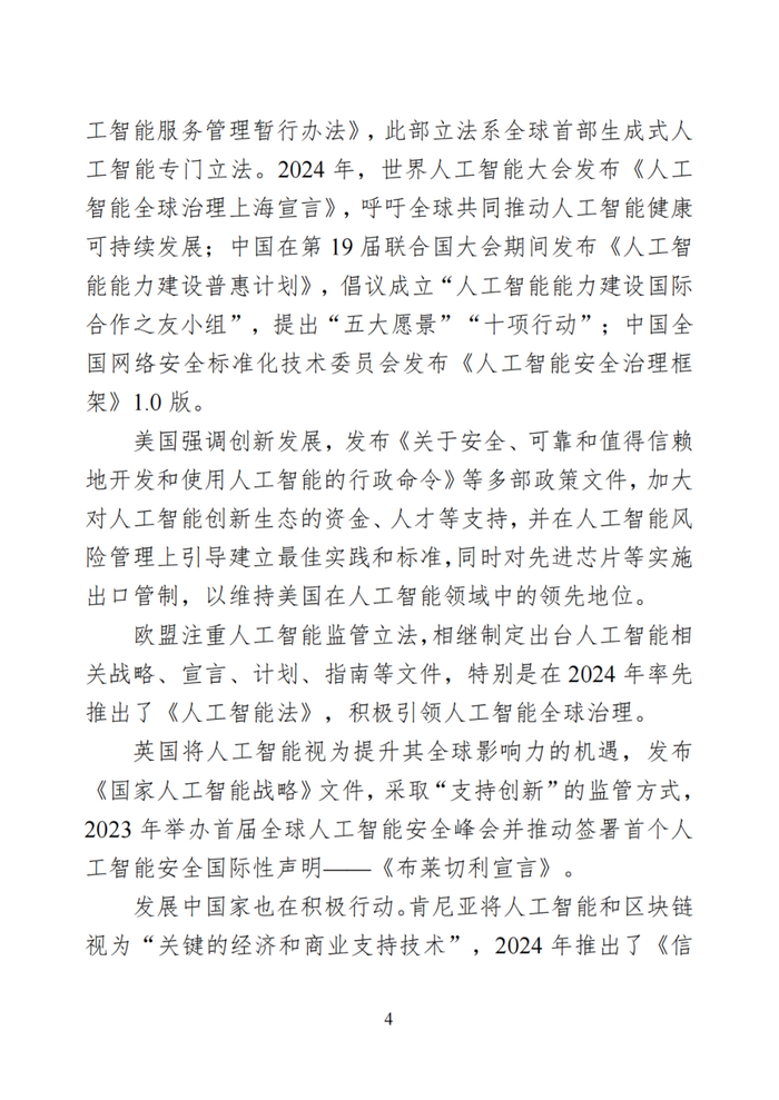 发展中国家也在积极行动。肯尼亚将AI和区块链视为“关键的经济和商业支持技术”,推出了《信息技术-人工智能-人工智能应用实践守则》。埃及组建了国家人工智能委员会,发布了《国家人工智能战略》等文件。哈萨克斯坦则发布了《2024-2029年人工智能发展构想(草案)》,加快构建本国AI生态系统。