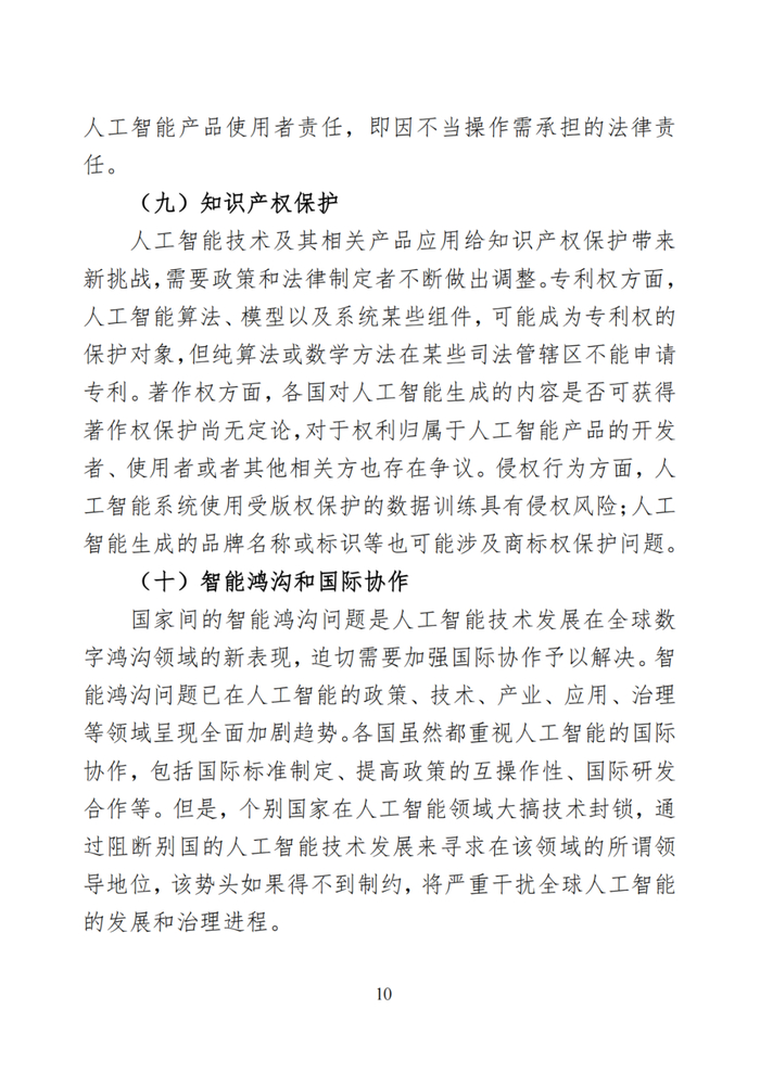 AI技术及其相关产品应用给知识产权保护带来新挑战。专利权方面,AI算法、模型以及系统某些组件可能成为专利权的保护对象;著作权方面,各国对AI生成的内容是否可获得著作权保护尚无定论;侵权行为方面,AI系统使用受版权保护的数据训练具有侵权风险。