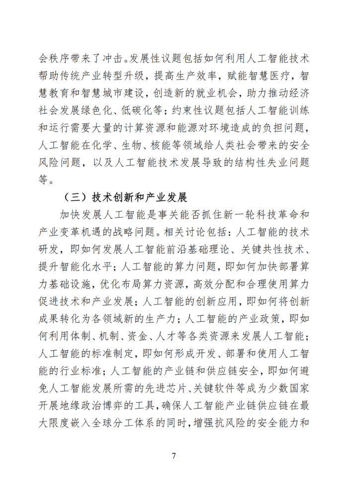 约束性议题则包括AI训练和运行需要大量的计算资源和能源对环境造成的负担问题,AI在化学、生物、核能等领域给人类社会带来的安全风险问题,以及AI技术发展导致的结构性失业问题等。