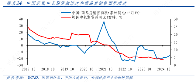 宏观政策的应对包括降息、货币化安置刺激需求、存量房“收储”减少供给、放松商品房交易限制性政策。央行数据显示2024年9月新发放个人住房贷款利率为3.31%,同比下降71BP,调降幅度不低,但相对于同时期的房价调整幅度,利率调降速度可能偏慢。我们预计居民部门去杠杆可能仍将延续一段时间。而明年支持性的货币政策或仍将在“房地产市场止跌企稳”的目标下发挥积极作用。