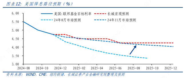 “降息路径收窄”的预期目前已经在市场形成较强共识,美债利率在美国降息周期开启后不降反升就是一个证明。截至11月27日,CME FedWatch显示市场预期2024年12月至2025 年 12 月共计降息3次、75BP,这比 8月5日较为激进的预期降息路径显著收敛。结合近期美国的就业、 PMI、通胀等数据看,我们认为今年 12月可能暂停降息,明年或在年初、年中各降一次,到明年年底,美国联邦基金目标利率或降至 4%-4.25%区间。