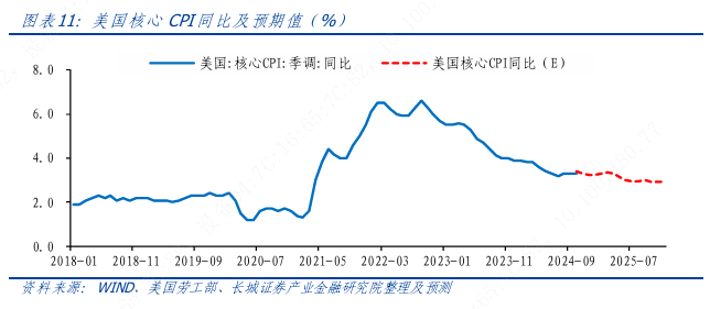 就货币政策而言,我们认为美国降息的路径已经收窄,在未来一年并没有快速下降的条件,主要由于美国核心通胀进一步下行存在阻力。特朗普上台后,其紧移民+高关税的组合政策可能降低美国就业供给和商品供给,不利于工资增速回落,对于核心商品与服务价格的回落也会遇阻;而房租价格更多反映房价,受前期降息预期影响房贷利率下降、房价一度回升,这也为房租同比回升埋下伏笔。