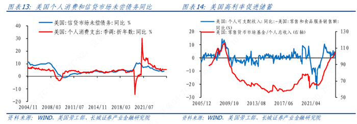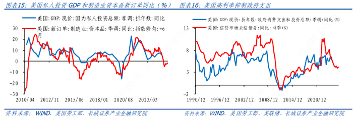高利率对居民部门的影响更多体现在去杠杆、增储蓄,对政府部门的影响体现在加大偿债压力、挤压消费投资支出的空间,这都将降低库存周期回升的弹性。2024年前10月,美国可支配收入增速与零售增速之间的差距持续徘徊在历史较高水平,而 2024 年上半年美国信贷市场未偿债务同比降至 4.15%,明显低于本轮加息初期(2022年3 月)的8.16%;2024 年 10 月美国零售货基占个人总收入比重达到近十年的最高点。我们理解这表明高利率确实一定程度抑制了居民消费投资需求,增加了储蓄。高利率对消费的抑制,也进而传导至私人部门投资,企业部门主动扩大投资再生产、补库存的动力不强。