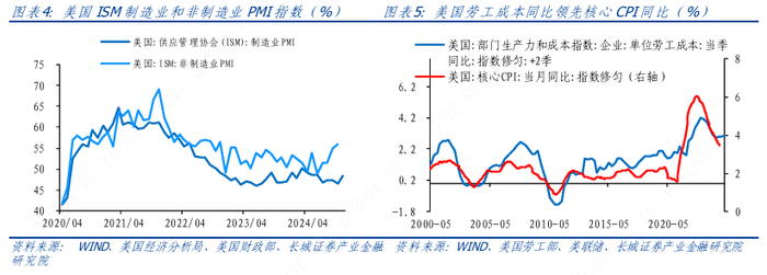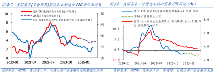 核心商品价格的主要驱动是工资增速水平,另外也一定程度受全球贸易价格影响。今年美国居民的耐用品需求大幅缩减,CPI核心商品同比的降速明显快于工资下降速度。我们理解这可能与全球产能有关,中国的耐用品价格增速也在下降。从工资增速角度外推,中性情形下2025年核心商品价格同比或仍将在0%以下震荡,同时我们提示紧移民+高关税政策或进一步抬升通胀。超级核心通胀更多与服务业景气度挂钩,而今年8月后美国非制造业 PMI 重新拐头向上,从这个角度看,明年下半年美国超级核心通胀同比或将抬头。
