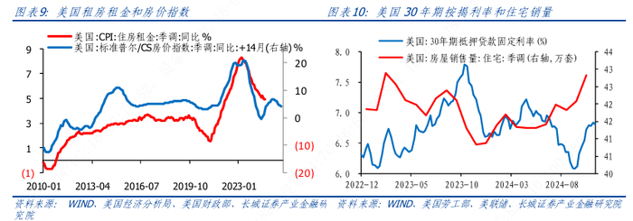 住所租金价格的领先指标是房价,我们根据美国标准普尔/CS房价领先 CPI住房租金大概14个月的规律,预计今年年底前后CPI房租可能会见底回升。房价对利率较为敏感,2024 年上半年降息预期不断强化,带动美国30年按揭贷款利率明显回落,对住宅销售量、价的提振可谓“立竿见影”。而2024年8月后,尽管按揭贷款利率重新回升,但美国住宅销量并未同步回落,房价环比也在不断走强,显示房价的韧性较强,或也预示房租回落障碍重重。