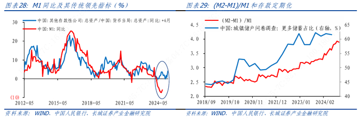2024 年 4月以来,M1同比由正转负,与我们关注的领先指标出现背离。理论上货币流通大致沿着央行-商业银行-实体企业的传导路径,我们以“其他存款性公司的总资产/货币当局总资产:同比” 衡量央行扩表向商业银行的传导,作为领先指标,指示M1同比,衡量实体部门资金活跃程度。2024年 4 月以来,央行向商业银行传导、流动性扩张的趋势上涨,但M1同比却不断下降,M2/M1大幅回升。