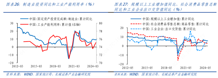2024 年以来,中国资本市场交易的趋势主要由“预期差”主导。宏观经济呈现出工业生产偏强、国内有效需求偏弱、整体物价偏低的特点,对国内经济形成拖累的两个重点领域分别在房地产(销售、投资同比负增长)和地方政府(化债、“紧日子”叙事制约支出能力和意愿)。在此背景下,降息的节奏与化债的规模是市场追踪货币与财政政策的重要观测点。