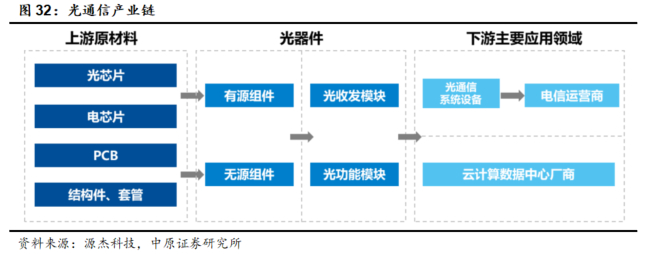 光芯片的性能直接决定光模块的传输速率,是光通信产业链的核心之一。光通信产业链中,组件可分为光无源组件和光有源组件。光无源组件在系统中消耗一定能量,实现光信号的传导、分流、阻挡、过滤等“交通”功能,主要包括光隔离器、光分路器、光开关、光连接器、光背板等;光有源组件在系统中将光电信号相互转换,实现信号传输的功能,主要包括光发射组件、光接收组件、光调制器等。光芯片加工封装为光发射组件(TOSA)及光接收组件(ROSA),再将光收发组件、电芯片、结构件等进一步加工成光模块。