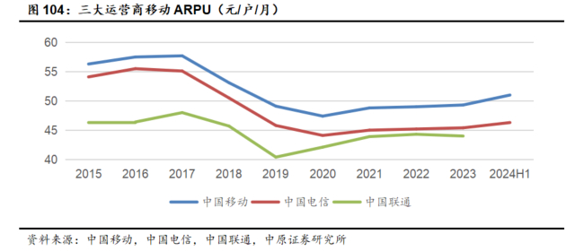 移动通信运营目前处于新旧动能转换的新发展阶段。2015年,国家提出“提速降费”,运营商承担重要社会责任,制定降费方案。2017年,三大运营商为抢夺客户,分别推出不限量套餐,行业竞争和政策压力导致资费开始大幅下降;2019年9月,由于经营压力,三大运营商陆续取消不限量套餐,行业竞争趋于理性,降费幅度趋缓。2020年开始,三大运营商移动ARPU恢复增长。2022年,中小微企业宽带和专线平均资费同比下降超10%,运营商面向脱贫户、老年人、残疾人等特殊群体实施精准降费。此外,2022年政府工作报告中未涉及“提速降费”表述,运营商发展重心转向提速提质。2023年,中国移动、中国电信、中国联通的移动ARPU分别为49.3元、45.4元、44元,同比+0.60%、+0.40%、-0.68%。2024H1,中国移动、中国电信的移动ARPU分别为51元、46.3元,同比-2.67%、+0.22%。目前运营商流量资费已大幅下降,预计政府再次引导提速降费的概率较小。