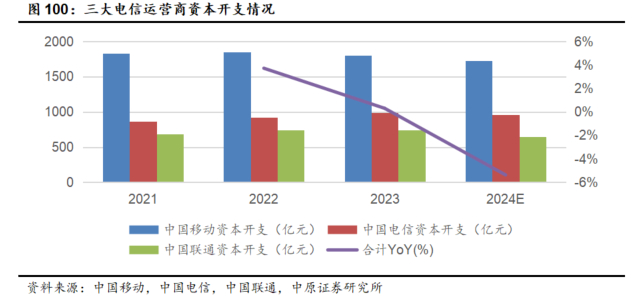 三大运营商资本开支结构不断优化,加大智能算力基础设施投入。运营商投资一直是行业发展的晴雨表和风向标。三大运营商资本开支在2020-2022年是高峰期,2023年国内三大运营商资本开支合计3529.7亿元,同比增长0.3%。三大运营商对5G建设投入减少并加大算力网络的投入。预计2024年三大运营商资本开支合计3340亿元,同比下降5.4%。中国移动、中国电信2024年资本开支占收比预计将下降至20%以内。未来两年运营商总体资本开支将保持稳中有降,资本开支占收比持续下降。资本开支下降有望降低未来折旧和摊销成本,保持业绩稳健增长的预期。