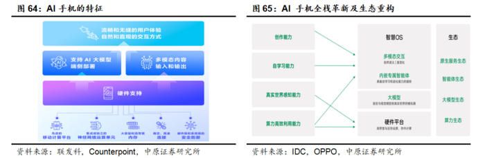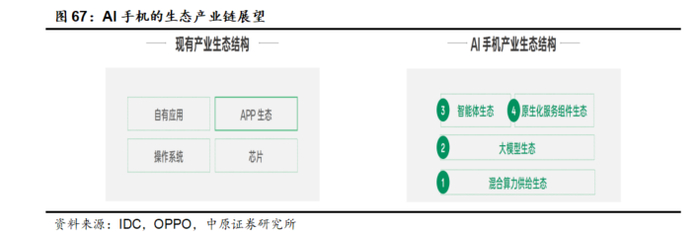 根据IDC和OPPO发布的《AI手机白皮书》,新一代AI手机的出现将改变手机产业生态结构。现有产业生态结构是以芯片和操作系统作为底层,APP生态和自有应用在上层。AI手机产业生态结构是以混合算力供给生态为基石,大模型生态位于中层,上层是智能体生态和原生化服务组件生态。具体来看,手机生态产业链的重构包括以下四个方面: