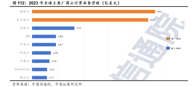 天翼云和移动云借助运营商资源优势聚焦数字化转型方案。北美云计算巨头持续领跑全球,第二梯队云厂商深耕细分技术领域保持追赶。2023年,微软和亚马逊凭借AI云产品改造和市场布局优势,分别以962.13亿美元和907.57亿美元的营收稳居全球市场前两名。第二梯队服务商保持积极追赶态势,但受市场布局先手影响,营收增长有限,转向业务整合,通过深化主营业务技术优势,拉高领域技术壁垒,推动其业务增长。谷歌云基于开源技术的领导地位大力发展AI工具,IBM关注混合云与AI解决方案咨询,天翼云和移动云借助运营商资源优势聚焦数字化转型方案。运营商受益于数字经济和数字中国战略,逐步向“网、云、数、算”综合信息服务提供商转型。预计在未来较长的周期内,运营商产业数字化业务作为营收增长主要驱动力的地位将持续巩固,数字经济和实体经济融合的逐渐深化将赋予运营商新的价值。