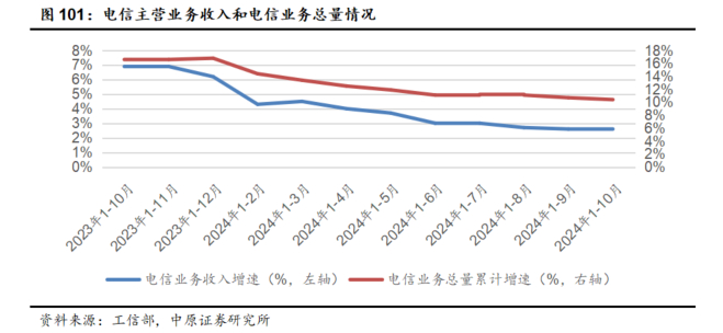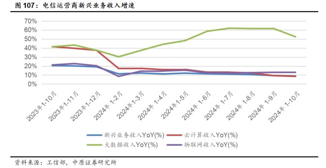 运营商的新兴业务收入保持较快增长。IPTV(网络电视)、互联网数据中心、大数据、云计算、物联网等新兴业务快速发展,2024年1-10月实现新兴业务收入3583亿元,同比增长8.9%,占电信业务收入的24.7%,拉动电信业务收入增长2.1pct。其中,云计算、大数据、物联网业务收入同比分别增长8.5%、52.5%、13.2%。物联网用户规模快速扩大。截至2024年10月,三大运营商蜂窝物联网终端用户达26.25亿户,同比增长16.4%。