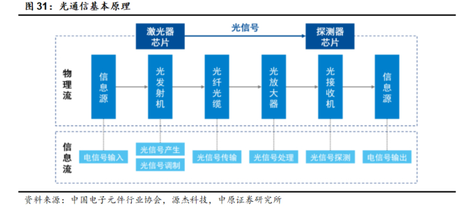 光通信行业包括基础构件(光芯片、光器件/光模块、光纤光缆)和设备集成,最终应用领域主要为电信市场业务及数据中心业务,是典型的技术密集型、人才密集型、资金设备密集型产业。光通信是以光信号为信息载体,以光纤作为传输介质,通过电光转换,以光信号进行传输信息的系统。光通信系统传输信号过程中,发射端通过激光器芯片进行电光转换,将电信号转换为光信号,经过光纤传输至接收端,接收端通过探测器芯片进行光电转换,将光信号转换为电信号。从信息流角度看,光通信主要包括光信号产生、光信号传输与处理、光信号探测等环节,其中:光收发单元起着光电转化的作用,在信息流中对应着光信号产生、调制与探测;光分路器、AWG、VOA、光开关和光放大器对应光信号的传输与处理。
