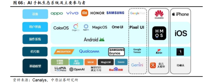 苹果、谷歌和三星等全球主要厂商以及OPPO、vivo、小米和荣耀等国内厂商都走在将生成式AI功能集成到其设备的前列。其战略各不相同,从开发专用AI芯片到加强利用AI的生态系统集成来提升用户体验,各大厂商通过对硬件和软件的大量投入来保持竞争优势。