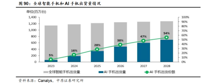 从技术趋势来看,功能的迭代升级及AI赋能技术创新的加持,后续AI手机市场渗透空间有望进一步提升。根据Canalys的预测,2024年,全球16%的智能手机出货量为AI手机,到2028年,该比例将激增至54%。为了实现此增长,生成式AI功能需要下沉到旗舰机型以外的市场。受消费者对AI助手和端侧处理等增强功能需求的推动,2023-2028年间,AI手机市场的CAGR为63%。预计这一转变将先出现在高端机型上,然后逐渐为中端智能手机所采用,反映出端侧生成式AI作为更普适性的先进技术渗透整体手机市场的趋势。
