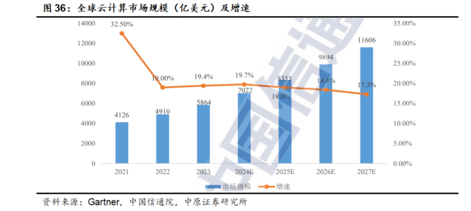 云计算市场持续稳定增长。从整体来看,全球云计算市场进入稳定增长阶段。Gartner数据显示,2023年以IaaS、PaaS、SaaS为代表的全球云计算市场规模达到5864亿元,增速19.4%。由疫情带来的波动已回落到正常水平,云计算仍是市场高稳定增长的不可或缺的技术。随着云计算与生成式AI、大模型、算力的深度融合,2024-2027年云计算市场的年复合增长率约为18.6%,预计到2027年全球云计算市场规模将达到1.16万亿美元。