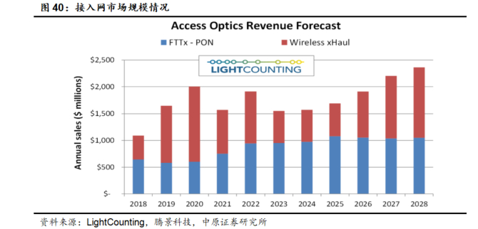 接入网方面,由于RAN(无线接入网络)和FTTx部署的正常周期性之外的库存过剩,2023年接入网市场有所下降。随着我国市场结束10G PON部署周期,而北美和欧洲在政府资助项目的推动下逐步增加10G PON部署,FTTx网络的PON销售将保持稳定。25G和50G PON未来有望提供新的增长动能。无线前端(Wireless Fronthaul)增速较慢,因为我国的5G网络部署已接近完成。但随着未来6G部署的开始,该细分市场将在2026-2027年恢复增长。LightCounting预计,到2028年接入网市场的年复合增长率将达到9%。