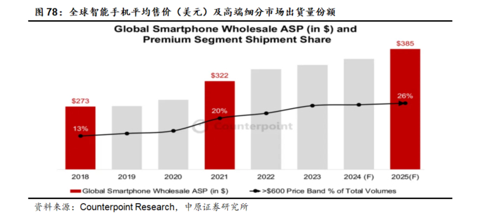 受SoC和内存价格上涨以及生成式AI设备的推动,智能手机的平均售价上升。根据Counterpoint Research的测算,2024年全球智能手机的平均销售价格预计同比增长3%,达到365美元;2025年将进一步增长5%。这一增长可能由多重因素引起,包括智能手机向5G转型、算力的提高以及向高端智能手机的明显转向等。2025年,消费者对生成式AI的兴趣增加将主要支持高端化趋势,因为生成式AI需要在CPU、NPU和GPU能力方面有显著提升的SoC。此外,在成熟的智能手机市场上,手机的更换周期更长,手机厂商需要采用包括生成式AI在内的先进科技来促进高端市场产品的不断升级。