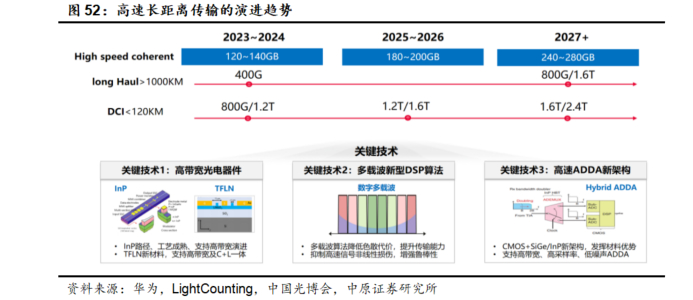 在城域网、骨干网等传输网方面,随着AI、大数据、云计算等技术的飞速发展及“东数西算”等构建全国一体化算力网工程的推进建设,云计算需求和数据流量呈现指数级增长,对网络带宽提出了更高要求。提升光传输系统单波速率与传输距离、提高光纤通信系统带宽利用率,以满足不断增长的网络流量需求,成为运营商和设备商的共同追求。传统100G无法满足算力网络业务的新需求,骨干网和城域网将升级到400G,100G/200G和OXC/ROADM将在城域接入网广泛部署。400G技术作为下一代骨干网的核心承载技术,具备更高传输速率、更大带宽、更好扩展性等优势,能够满足大数据中心和通信网络日益增长的需求,提供更多的数据传输通道,更好地支持高密度集成和低能耗解决方案。