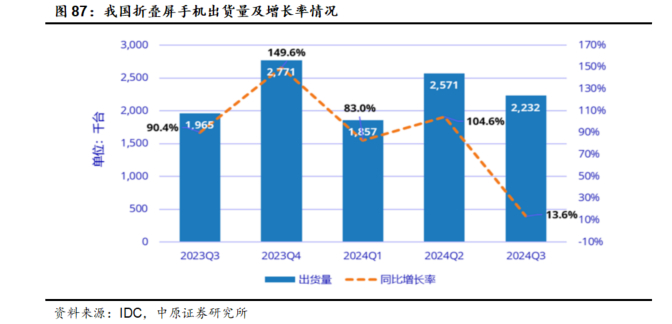 2024Q3,我国折叠屏手机出货量达到223万台,增速较前期明显放缓。折叠屏手机自2019年问世以来,经过5年的快速发展,截至2024Q3,市场渗透率为3.2%。由于缺乏更多的使用场景,产品价格和使用体验相比直板产品并无绝对优势,导致折叠屏手机用户数量短期难有更大突破。2024Q3,华为以41.0%的折叠屏手机市场份额保持优势,新推出的三折产品开辟新的赛道。华为全球首部三折叠屏手机有望从硬件、软件和使用场景进一步推动折叠屏手机市场的发展。