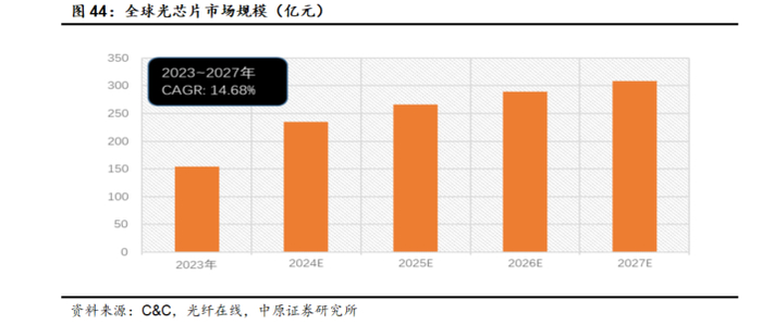 随着AI应用推动技术创新和市场需求的不断增长,光芯片行业正迎来新一轮的发展机遇。预计在未来几年内,全球光芯片市场将保持稳健的增长态势,为整个光通信行业带来发展动力。根据C&C的测算,2023年全球光芯片市场规模达到154亿元人民币(约22亿美元),同比下降15%,主要受到接入网市场对光芯片需求和价格同步下降的影响。尽管如此,AI带动的数据中心市场对高速率光芯片的持续需求在一定程度上缓解了市场的下滑压力。预计2024年全球光芯片市场将迎来强劲复苏,增速有望超过50%,这将创下历年来的最高增长记录。2023-2027年,全球光芯片市场的年复合增长率将达到14.86%。