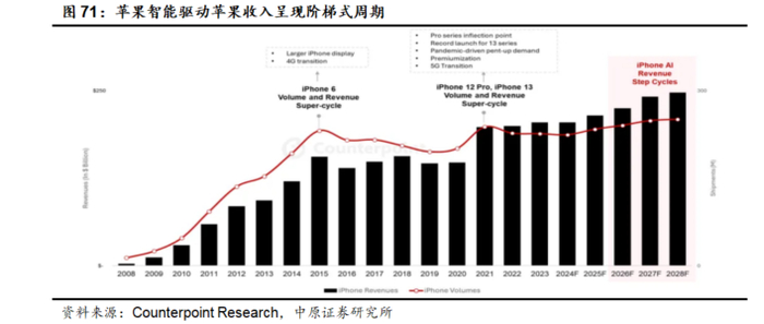 从历史上看,苹果有过两次关键的超级周期:第一次是2016年的iPhone 6,第二次是2021年的iPhone12/13。虽然这两次超级周期发生在不同的年份,其共同的驱动力是被压抑的需求。第一次是源自于消费者对更大显示屏的渴望,第二次是得益于在新冠疫情积攒的换机需求。在 iPhone换机周期延长的背景下,iPhone 16的发布正值苹果发展的关键节点。苹果智能在功能和地区方面的推出预计将分阶段进行,因此其整体影响可能会随着时间的推移而显现,使苹果的收入呈现阶梯式增长。苹果有望采用更先进的散热技术以支持端侧AI运行,这将带动硬件产业链升级。