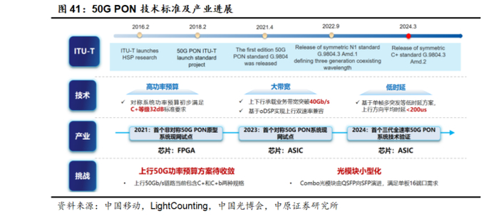 50G PON的国际标准化工作始于2018年,历时6-7年,50G PON标准在ITU-T中已基本成熟,包括物理层、TC层和模块的要求。50G PON技术作为全光万兆网络的关键技术,以超大带宽、低时延、应用及灵活切片等特性,在全球范围内获得了主流运营商的广泛认可,是未来宽带接入技术的重要发展方向。