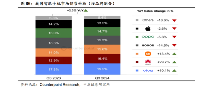 2024Q3,vivo以19.2%的市场份额位居首位,其多样化的产品组合和在各个价格段的畅销机型帮助vivo保持了领导地位。华为以16.4%的市场份额位列第二,小米以15.6%的份额位居第三。华为在Q3保持强劲反弹态势,在低基数上实现了30%的同比增长,Pura 70和Mate 60系列推动华为的大部分销量。小米市场份额的提升得益于其中高端的Redmi K系列和旗舰Mi系列的成功。
