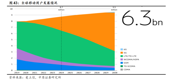 5G基础设施建设规模不断扩大。随着我国三大运营商持续三年完成5G基站的深度覆盖,5G网络覆盖、5G用户发展均取得可观的增长和部署,随后将进入室内覆盖阶段,对于中回传的需求逐渐释放,并进一步推动To C面向消费者领域的应用。根据移动通信全球行业组织(GSMA)和TD产业联盟(TDIA)的测算,2029年全球5G连接预计将占移动连接的一半以上,到2030年,5G连接数将达到55亿个。我国的5G基站建设规模和5G连接量位居全球前列,5G网络已覆盖所有地级市城区、县城城区,超90%的5G基站实现共建共享,5G网络正加快向集约高效、绿色低碳发展。GSMA预测到2024年年底我国的5G连接数将突破10亿,成为全球最大的移动通信市场,到2030年,我国5G连接将占全球总数的近三分之一。海外电信网络建设方面,5G用户的增长势头持续强劲。爱立信预计到2027年,5G将成为占主导地位的移动接入技术,预计到2030年,全球5G用户将达到63亿,占当时移动用户总数的67%。
