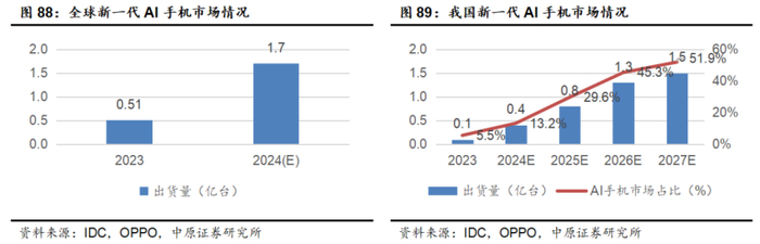 IDC预计2024年全球新一代AI手机的出货量将达到1.7亿部,约占智能手机整体出货量的15%。我国市场中,随着新的芯片和用户使用场景的快速迭代,新一代AI手机所占份额将在2024年后迅速攀升,在2027年达到1.5亿台,市场份额超过50%,未来主流机型将是AI手机。