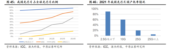 我国光芯片厂商的全球份额将进一步提升。根据ICC的测算,2019-2024年,我国光芯片厂商销售规模占全球光芯片市场的比例不断提升,中高速率光芯片增长更快。我国光芯片企业已基本掌握2.5G及以下速率光芯片的核心技术,2021年该速率国产光芯片占全球比重超过90%;10G光芯片方面,2021年国产光芯片占全球比重约60%,但不同光芯片的国产化情况存在一定差异,部分10G光芯片产品性能要求较高、难度较大,如10G VCSEL/EML激光器芯片等,国产化率不到40%;25G及以上光芯片方面,随着5G建设推进,我国光芯片厂商在应用于5G基站前传光模块的25G DFB激光器芯片有所突破,数据中心市场光模块企业开始逐步使用国产厂商的25G DFB激光器芯片,2021年25G光芯片的国产化率约20%,但25G以上光芯片的国产化率约5%,目前仍以海外光芯片厂商为主。