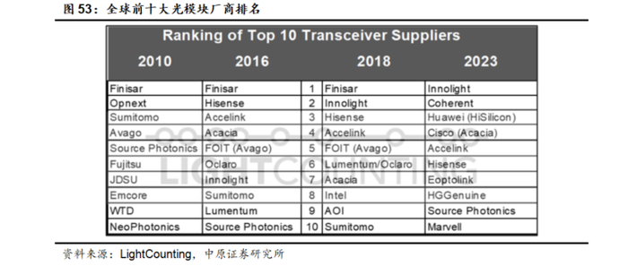 我国光模块厂商实力提升。光芯片下游直接客户为光模块厂商,近年来,我国光模块厂商在技术、成本、市场、运营等方面的优势逐渐凸显,占全球光模块市场的份额逐步提升。根据LightCounting的统计,2023年我国厂商中已有中际旭创、华为(海思)、光迅科技、海信宽带、新易盛、华工正源、索尔思光电进入全球前十大光模块厂商,光通信产业链逐步向国内转移。