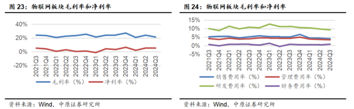 毛利率方面,2024Q3,物联网板块毛利率为21.32%,同比下降3.04pct;净利率为5.00%,同比提高1.73pct。费用率方面,2024Q3,物联网板块销售费用率、管理费用率、研发费用率、财务费用率分别为4.05%、3.42%、9.24%、0.83%,同比-0.95pct、-0.82pct、-2.08pct、+0.04pct。