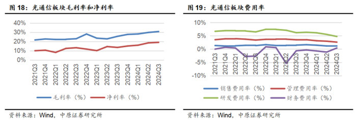毛利率方面,2024Q3,光通信板块毛利率为30.76%,同比提高5.23pct;净利率为19.02%,同比提高5.50pct。费用率方面,2024Q3,光通信板块销售费用率、管理费用率、研发费用率、财务费用率分别为1.19%、2.63%、4.76%、0.41%,同比-0.32pct、-0.88pct、-1.44pct、+1.04pct。