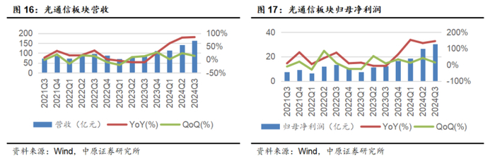 2024年前三季度,光通信板块实现营收419.40亿元,同比增长77.96%;实现归母净利润75.74亿元,同比增长143.40%。2024Q3,光通信板块实现营收162.73亿元,同比增长85.64%;实现归母净利润30.45亿元,同比增长145.99%。