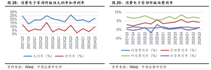 毛利率方面,2024Q3,消费电子零部件板块毛利率为21.41%,同比下降4.54pct;净利率为9.93%,同比下降1.92pct。费用率方面,2024Q3,消费电子零部件板块销售费用率、管理费用率、研发费用率、财务费用率分别为1.13%、4.16%、6.66%、1.13%,同比+0.06pct、-0.13pct、+0.49pct、+0.62pct。