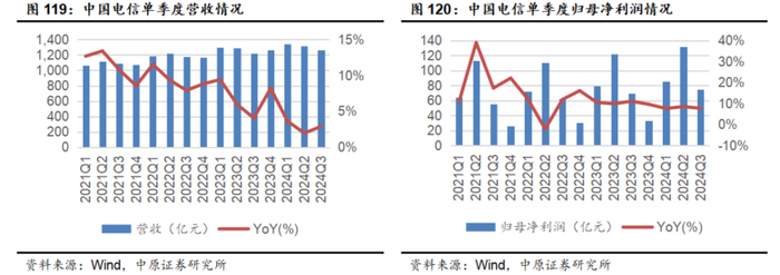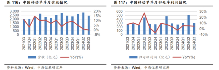 2024年前三季度,电信运营商板块实现营收14735.49亿元,同比增长2.45%;实现归母净利润1485.18亿元,同比增长5.94%。2024Q3,电信运营商板块实现营收4634.91亿元,同比增长1.39%;实现归母净利润404.66亿元,同比增长5.34%。