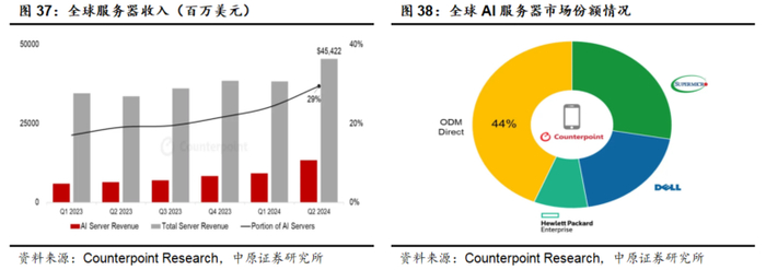 各大云服务商不断加码对AI相关投入,AI创新引发的算力竞赛推动硬件基础设施的不断升级扩容。在此背景下,AI服务器市场规模保持高速增长态势。由于对AI服务器的强劲需求,服务器市场在2024Q2急剧增长。自2022年推出ChatGPT问世后,在生成式AI这一热潮下,AI服务器的需求增加,服务器市场迅速增长。2024Q2,全球服务器收入达到454.22亿美元,同比增长35%;引领服务器市场崛起的AI服务器收入占所有服务器的29%。AI服务器头部厂商分别为戴尔、超微和HPE,但由于微软、亚马逊、谷歌和Meta继续定制自己的服务器,ODM直销占据主导地位,2024Q2 ODM直销占比为44%。