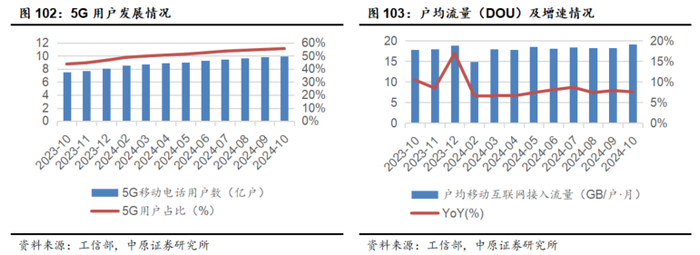 新型基础设施建设带动5G用户持续增长。截至2024年10月,三大运营商及中国广电的移动电话用户总数达17.89亿户,其中,5G移动电话用户达9.81亿户,占移动电话用户的55.6%,占比较2023年末提高9.0pct。未来5G移动电话用户占比仍具备较大增长空间。运营商开展用户细分行动,针对用户在速率、场景、体验等需求,推出差异化5G套餐服务,拓展5G多元化盈利模式。