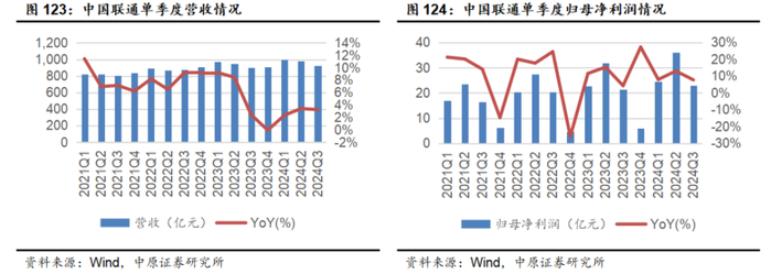 三大运营商重视股东回报,近年来股息率维持较高水平。截至2024年11月29日,中国移动A股、H股股息率分别为4.29%、6.90%,2023年全年派息率为71%,2024年中期派息率为63.3%;中国电信A股、H股股息率分别为3.97%、6.22%,2023年全年派息率和2024年中期派息率均超过70%;中国联通A股、H股股息率分别为2.83%、6.44%,2023年全年派息率和2024年中期派息率均为55%。中国移动和中国电信均表示从2024年起,三年内以现金方式分配的利润逐步提升至当年股东应占利润的75%以上。三大运营商的股东回报有望持续提升。