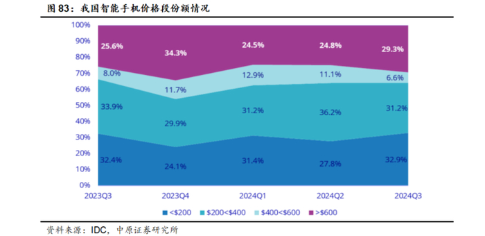 我国智能手机市场2024年平均单价相比2023年明显提升,除上游成本增长的因素,部分消费者也愿意接受更高价格的产品。而华为出货量的稳步回升推动高端市场份额的增长。2024Q3,我国600美元以上高端手机市场份额达到29.3%,同比增长3.7pct。厂商在继续关注高端产品的同时,也在重点打造高颜值、长巡航、防摔防水的中低端产品来满足更多普通消费者的使用需求和场景。2024Q3,我国200美元手机市场份额32.9%,同比增长0.5pct。