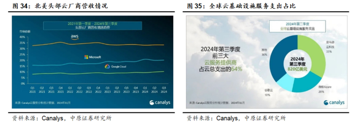 2024年第三季度,云服务市场延续强劲的增长态势。前三大云厂商均表示从AI投资中获得了积极回报,AI的应用开始对其整体云业务表现产生影响。这种回报反映了AI作为云计算创新和竞争优势的关键驱动因素的日益重要性。 随着AI技术的广泛应用,对高性能计算和存储的需求持续上升,这对云厂商的基础设施扩张提出了更高要求。为应对这一挑战,领先的云厂商正优先大规模投资下一代AI基础设施。为规避投资不足的风险,云厂商采取超额投资策略,确保其服务能力能够满足AI客户不断增长的需求。云厂商资本支出将继续保持快速增长的势头,预计这一趋势将延续至2025年。