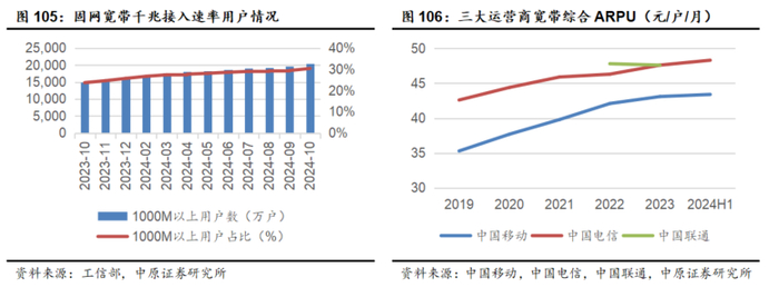 千兆用户占比超三成。截至2024年10月,三大运营商固网宽带接入用户总数达6.68亿户,其中,100Mbps及以上接入速率的固网宽带接入用户达6.33亿户,占总用户数的94.8%;1000Mbps及以上接入速率的固网宽带接入用户达2.03亿户,占总用户数的30.4%,占比较2023年末提升4.7个百分点。在高速率用户持续增长拉动下,家庭户均接入带宽达506.9Mbps/户,同比增长15.1%。高速率用户占比未来仍有较大增长空间。