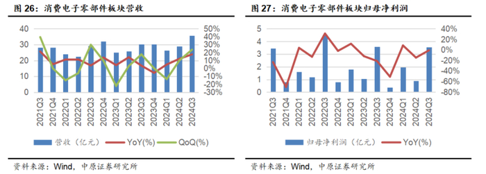 2024年前三季度,消费电子零部件板块实现营收90.84亿元,同比增长11.97%;实现归母净利润6.39亿元,同比下降0.47%。2024Q3,消费电子零部件板块实现营收35.71亿元,同比增长17.72%;实现归母净利润3.55亿元,同比下降0.81%。