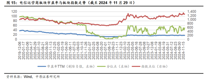 截至2024年11月29日,电信运营商板块PE-TTM(剔除负值)为17.02X,处于近5年49.2%分位,近10年31.0%分位。