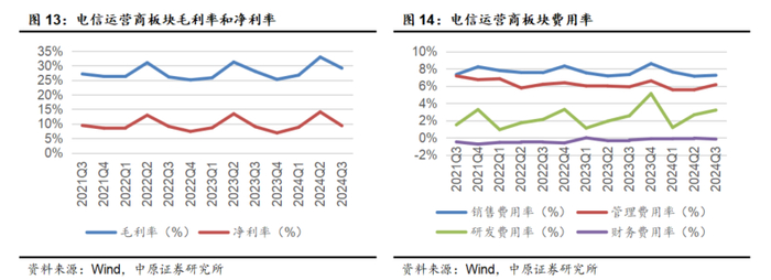 毛利率方面,2024Q3,电信运营商板块毛利率为29.15%,同比提高1.14pct;净利率为9.35%,同比提高0.34pct。费用率方面,2024Q3,电信运营商板块销售费用率、管理费用率、研发费用率、财务费用率分别为7.25%、6.16%、3.21%、-0.15%,同比-0.09pct、+0.25pct、+0.66pct、+0.11pct。