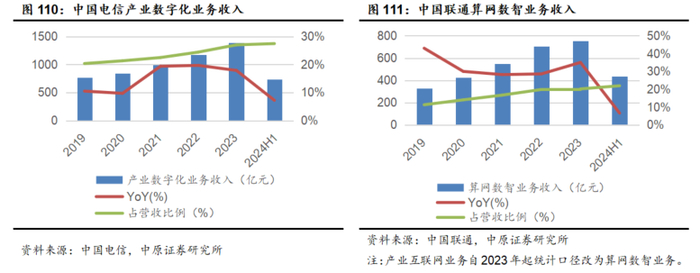 运营商推动政企业务从价值向规模延伸,收入增速放缓,营收占比持续提高。2024H1,中国移动实现DICT业务收入652亿元,同比增长8.4%,占营收比为11.9%,占比较2023年末提高1.3pct;中国电信实现产业数字化业务收入737亿元,同比增长7.2%,占营收比为27.5%,占比较2023年末提高0.5pct;中国联通实现算网数智业务收入435亿元,同比增长6.6%,占营收比为21.9%,占比较2023年末提高1.7pct。