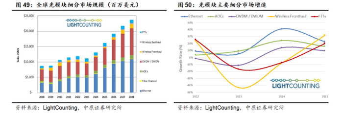 光电子、云计算技术等不断成熟,将促进更多终端应用需求出现,并对通信技术提出更高的要求。受益于信息应用流量需求的增长和光通信技术的升级,光模块作为光通信产业链最为重要的器件保持持续增长。根据LightCounting的预测,全球光模块市场预计在2024-2028年将以15%的复合年增长率扩张。对AI集群应用中以太网光模块的强劲需求将是增长的主要因素,云厂商运营的DWDM网络的升级也将促进总量增长。